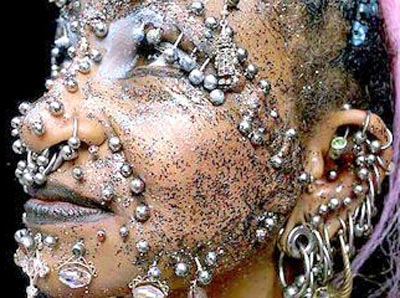 Самым распространенным был пирсинг губ. Многие эфиопские племена по сей день прокалывают губы и продевают в них кольца. Если же вам случится побывать в Африке и увидеть женщину с проколотой губой и вставленным в нее железным стержнем, загнутым на конце, знайте — дама замужем и флиртовать с красавицей не стоит...